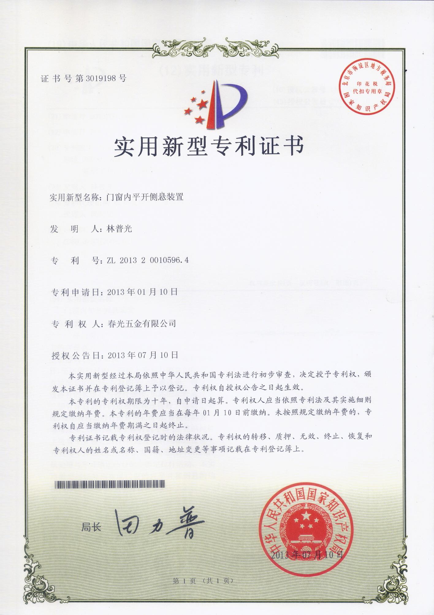 門窗內(nèi)平開側(cè)懸裝置實(shí)用新型專利證書 |