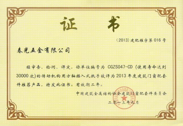 型號CGZS047-CD的傳動機構(gòu)用方軸插入式執(zhí)手被評為2013年度建筑門窗推薦產(chǎn)品 |