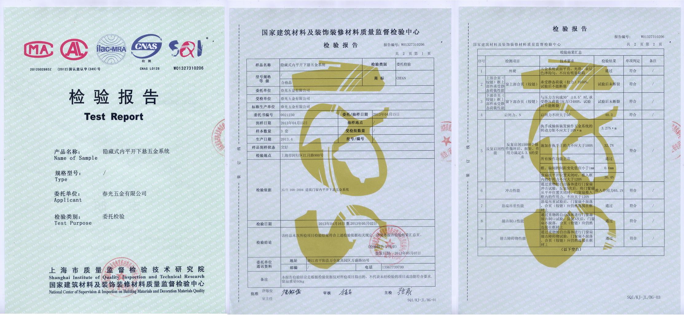 隱藏式內(nèi)平開下懸五金系統(tǒng)檢驗報告 |