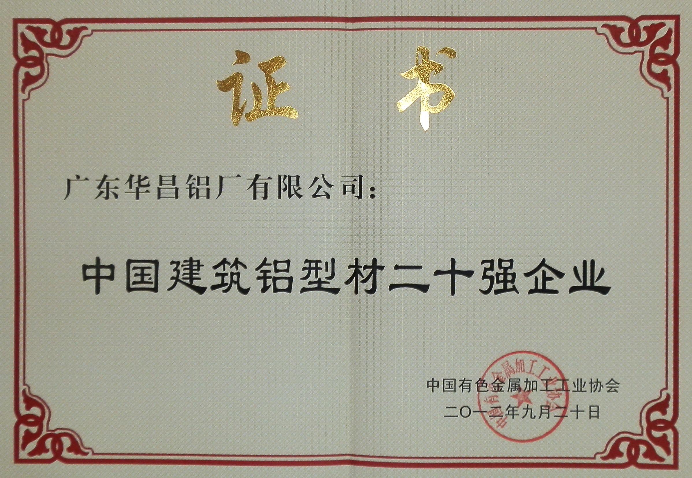 2012年中國建筑鋁材二十強證書 |