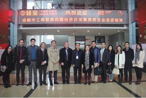 2015年12月10日,“成都市工商聯第四期經濟沙龍暨英姿企業走進硅寶”活動在成都硅寶科技股份有限公司隆重舉行。成都市工商聯副主席溫艷莉、中國英國商會主席馬克·班克洛夫,率中國西南英國商會會員企業代表一行,蒞臨成都硅寶科技股份有限公司參觀考察。硅寶科技總裁王有治帶領團隊予以熱情接待。