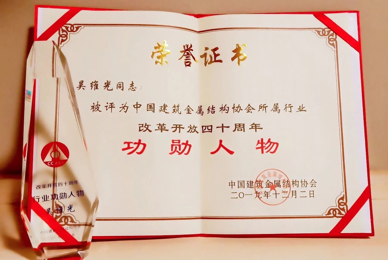 華建鋁業集團董事長吳維光當選中國建筑金屬結構協會第十一屆理事會副會長,同時被授予“中國建筑金屬結構協會所屬行業改革開放四十周年‘功勛人物’”。