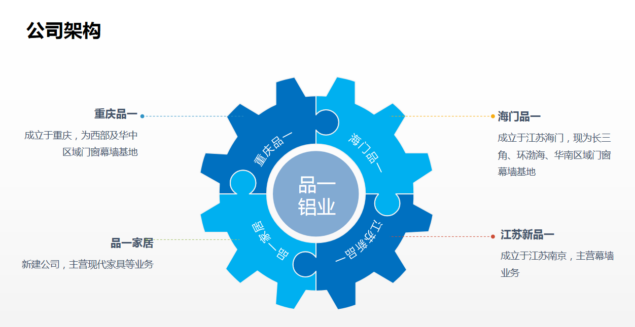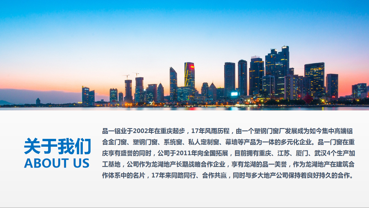 品一鋁業(yè)于2002年在重慶起步,17年風雨歷程,由一個塑鋼門窗廠發(fā)展成為如今集中高端鋁合金門窗、塑鋼門窗、系統窗、私人定制窗、幕墻等產品為一體的多元化企業(yè)。品一門窗在重慶享有盛譽的同時,公司于2011年向全國拓展,目前擁有重慶、江蘇、廈門、武漢4個生產加工基地,公司作為龍湖地產長期戰(zhàn)略合作企業(yè),享有龍湖的品一美譽,作為龍湖地產在建筑合作體系中的名片,17年來同路同行、合作共贏,同時與多大地產公司保持著良好持久的合作。