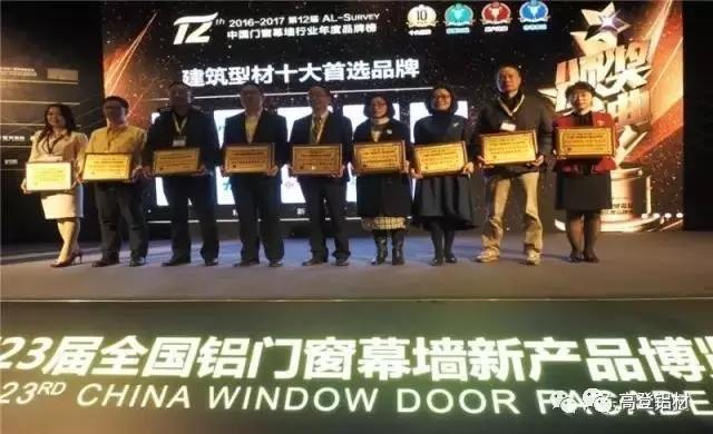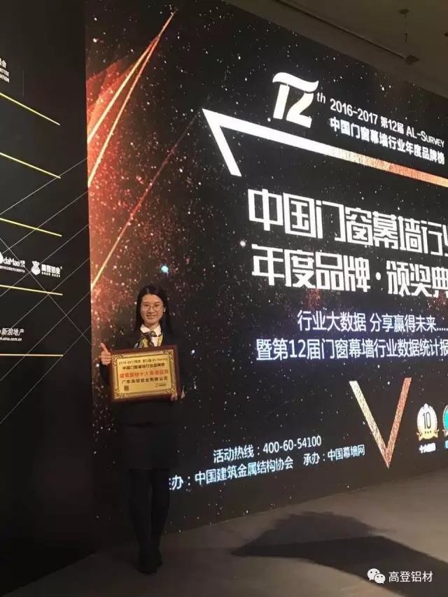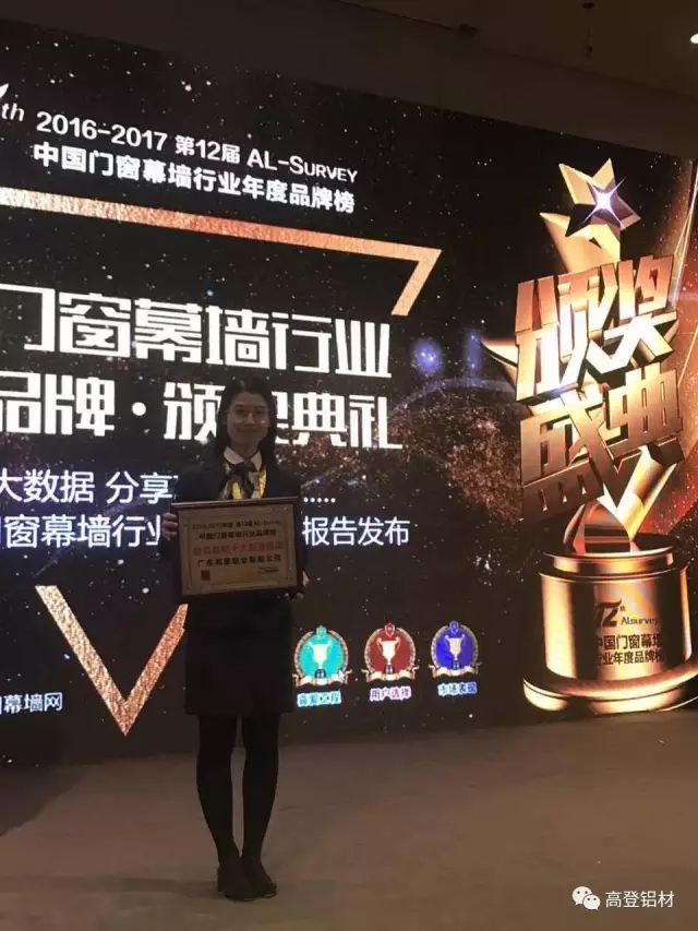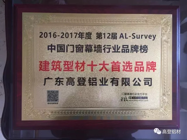| 高登鋁材,高瞻遠(yuǎn)矚,登峰造材 攜手高登,共創(chuàng)未來(lái)。高登鋁材與您一起締造美好生活!有建筑,有家的地方就有高登鋁材!高登鋁業(yè),你身邊的綠色鋁建筑系統(tǒng)解決方案提供商! 2017年3月15日,萬(wàn)眾矚目的“第十二屆AL-Survey2015-2016中國(guó)幕墻網(wǎng)年度大型讀者調(diào)查評(píng)選活動(dòng)”頒獎(jiǎng)儀式于廣州富力君悅大酒店隆重舉行。頒獎(jiǎng)儀式上公布了“建筑型材十大首選品牌”的入選企業(yè)名單,其中高登憑借在市場(chǎng)中的優(yōu)異成績(jī)和企業(yè)強(qiáng)大綜合實(shí)力,成功登上了“建筑型材十大首選品牌”榜單。