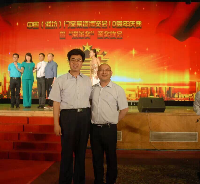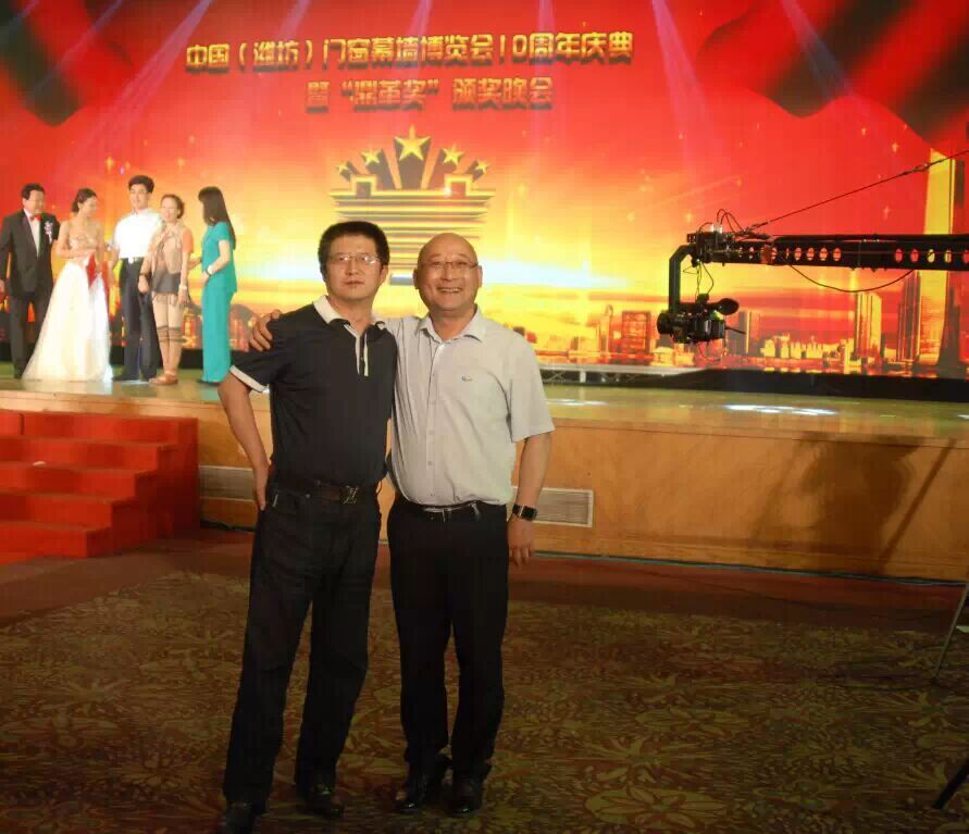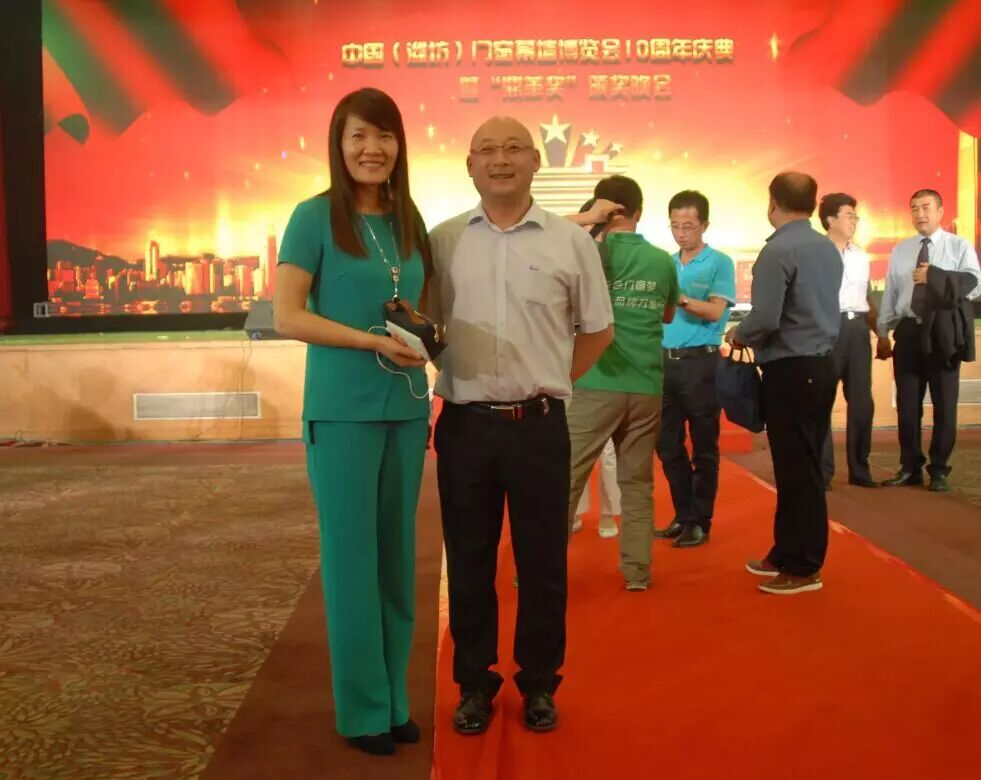 ↑濰坊富華國際展覽中心有限公司副總經(jīng)理馬麗,飛度膠業(yè)總經(jīng)理丁大宏合影留念