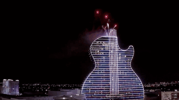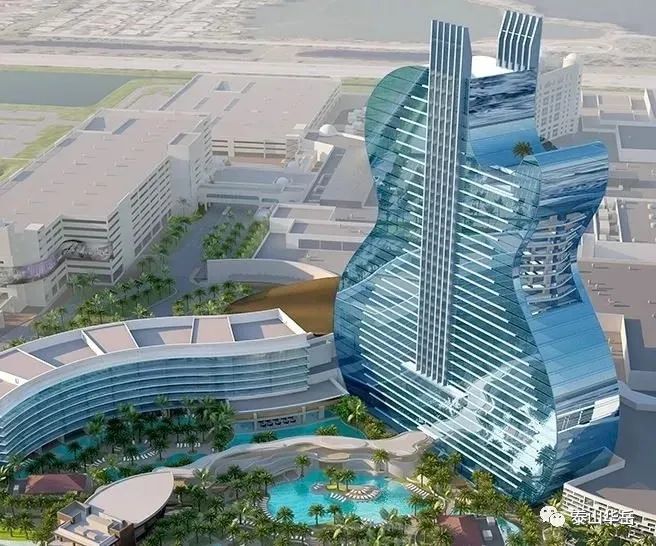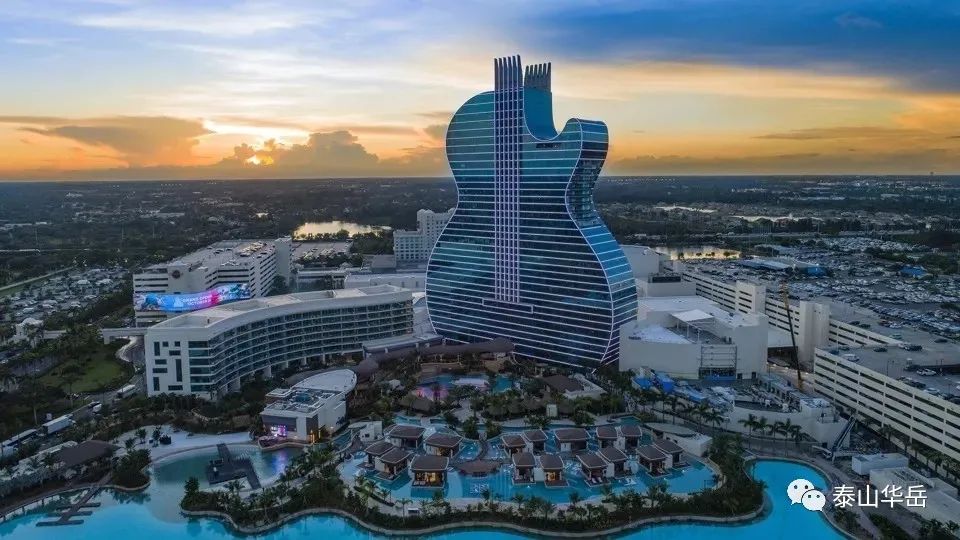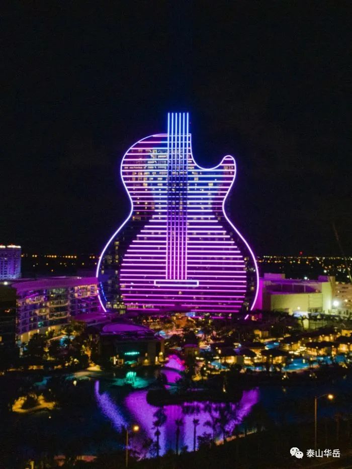 | 全球首棟吉他大廈位于佛羅里達州好萊塢的塞米諾爾硬石酒店及賭場是物業擴張的一部分,估計耗資15億美元,共36層,這座400英尺高的吉他形酒店非常引人注目。 吉他造型,配合燈光、煙花、音樂,更強的帶入感,置身其中留戀往返,吸引萬千游客蜂擁而至,使酒店成為體驗性的中心和南佛羅里達州的照明建筑信標。 在酒店進行盛大開幕之際,是由來自蒙特利爾的創意機構Float4與DCL視覺傳達設計公司共同為開幕儀式設計了獨特的霓虹燈光秀。將400英尺高的外墻變成了LED墻,并配備了230萬個LED燈,視頻地圖和激光。將每天進行兩次燈光表演,其敘述和主題向音樂對Hard Rock故事的重要性致敬。 ▼酒店全景overlook to the hotel