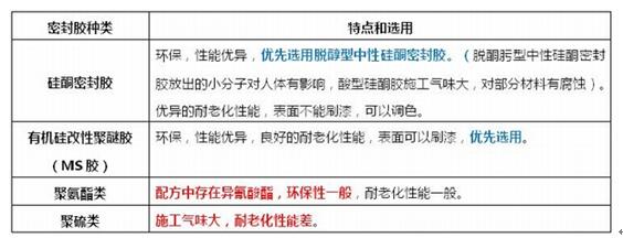 按照總揮發性有機物(TVOC)的限量值對比:本體型<水基型<溶劑型,從標準要求的總揮發性有機物(TVOC)的限量值看,溶劑型總揮發性有機物(TVOC)相比其他類型是明顯大很多。按照可能含有的有害物質種類來看,溶劑型密封膠可能含有甲苯、二甲苯、鹵代烴、甲苯異氰酸酯等;水基型密封膠可能含有游離甲醛;本體型密封膠中的聚氨酯類可能含有苯、甲苯、甲苯二異氰酸酯,環氧類可能含有苯、甲苯、二甲苯。依據上述各類密封膠的TVOC和有害物質的限量的明確要求,從綠色環保的角度上來選膠,我們建議:選擇總揮發性有機物(TVOC)最低、有害物質含量最少的密封膠,即優先選擇本體型密封膠。 目前市面上,室內裝飾接縫用密封膠中常見的本體型密封膠有:有機硅類(硅酮膠、MS膠)、聚氨酯類、聚硫類等。對于這些密封膠,又該如何選擇呢?從綠色環保的角度,我們建議參照如下的選用原則選擇密封膠:表4 常見的本體型密封膠的選用原則