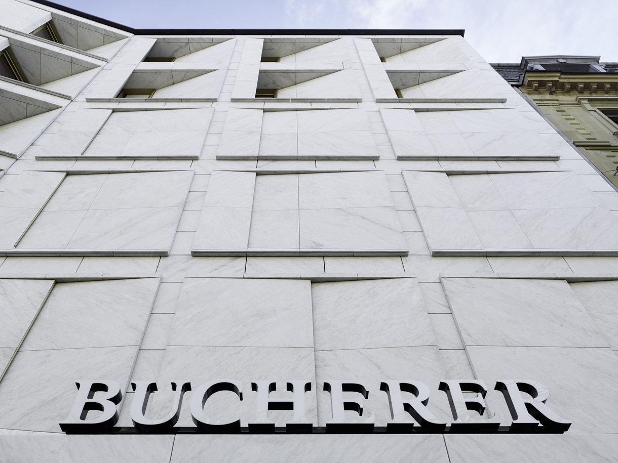 該棟建筑由蘇黎世事務所Haratori和阿姆斯特丹事務所Winhov負責設計。在翻新的建筑結構中,設計師完美地呈現了客戶對于行業需求的定位。2017—2018年重新設計的建筑外立面大理石幕墻,使這棟商業建筑與周圍環境融為一體。根據建筑師的設計理念,翻修后的該棟建筑同時代表了永恒、永久、創新和完美,這正是“寶嘉爾的核心理念”。建筑的一層采用了青銅作為幕墻裝飾材料,精心設計過的大理石面板被用于上層建筑的外立面幕墻。這些石料來自瑞士提契諾州唯一的大理石采石場。Haratori事務所在談到建筑的設計時說:“我們精確地將來自馬吉亞山谷的大理石進行了藝術加工,并將其外觀重新定義為類似珠寶的大理石。像日晷一樣,整個外立面幕墻化身為白晝和四季的形象!贝罄硎〉裼袝r呈現的是平滑和柔軟感,隨后又能呈現出銳利和整齊感,這都取決于視覺的移動。