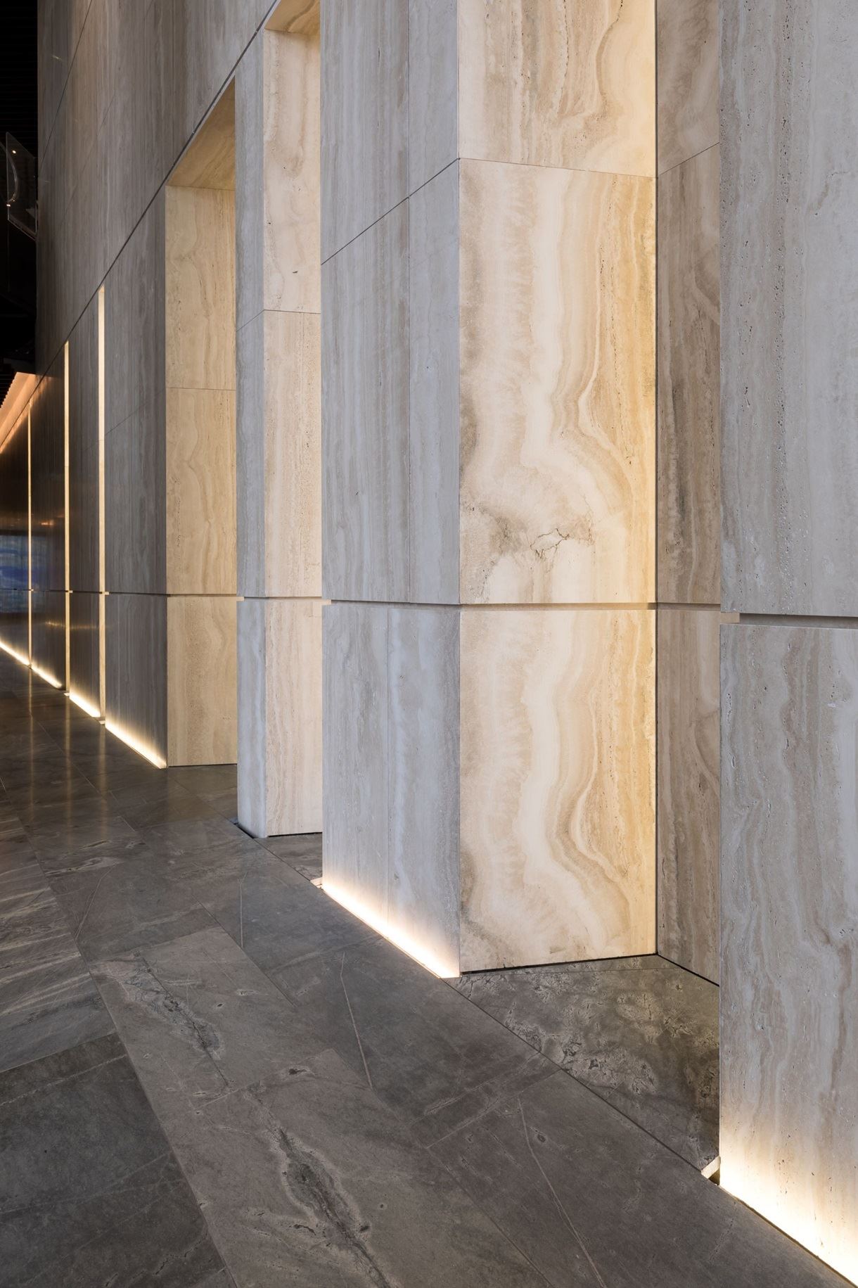 10,000顆慧魚齊平式背栓FZPII15x15M8i將石灰石面板固定在建筑內部的幕墻上,背栓本身如同隱形一般。 圖片來源:TilePeople