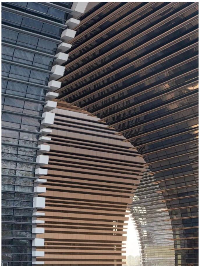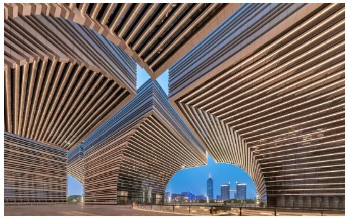常州文化廣場是由德國GMP建筑事務所設計的建筑綜合體,其獨特巨大懸挑結構由六個高50米的模塊組成。這座建筑綜合體在豐富的建筑表現和功能用途上展現多樣性,但在外觀上呈現出統一和整體的視覺效果。六個單元的巧妙組合形成了一組雕塑感十足的建筑群,為城市公共活動提供了一個完整的、同一屋檐下的載體。項目已于2020年竣工并開放。