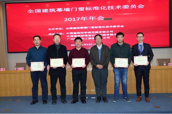 硅寶科技董事長王有治(左一)上臺領獎 會議就幕墻門窗標準化技術委員會2017年度工作進行了歸納總結。針對標準化工作推進過程中遇到的困難,標委會要求全體委員不忘初心、砥礪前行,積極、充分發揮各自優勢,共同為中國建筑幕墻門窗標準化工作發展做出努力。