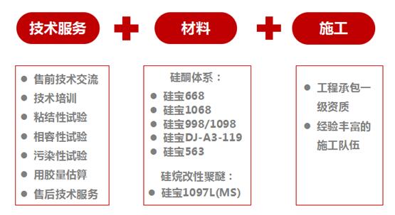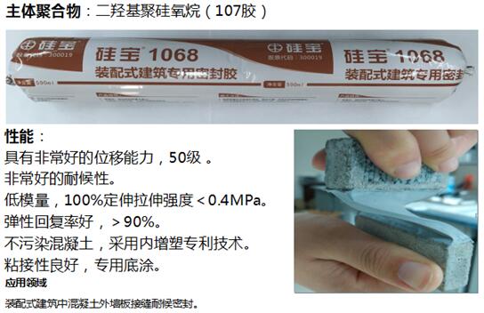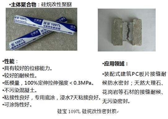 硅寶1097L硅烷改性密封膠 硅寶科技潛心研究、開發出包括硅酮、MS在內的“裝配式建筑專用密封膠”系列產品。該系列產品,具備高斷裂伸長率、高彈性、低模量、優異的粘接性能、優良的耐老化性能和無污染性。同時,硅寶科技可為裝配式建筑提供內外墻接縫、門窗防水密封、室內全裝修、防火封堵等整體密封解決方案。