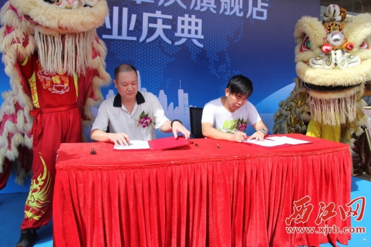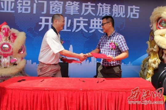 亞鋁集團銷售中心總經理黃志波與亞鋁門窗肇慶旗艦店張衛東共同簽署亞鋁門窗運營中心營銷合作協議