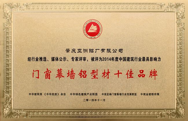 肇慶亞洲鋁廠有限公司被評為“2014年度中國建筑行業最具影響力門窗幕墻行業十佳品牌”,是對亞洲鋁廠一直以來堅持“管理樹立行業標桿,質量成就鋁材精品”企業發展理念的充分肯定,也是對亞洲鋁廠在門窗幕墻領域上技術創新、產品更新升級能力的積極認可。多年來,亞洲鋁廠不斷開發具有自身知識產權的門窗系統,始終保持在門窗市場的競爭優勢,同時,聯合其他具有專利技術和質量保障的門窗配件企業共同開發全新的產品系列,如與絲吉麗婭和泰諾風保泰合作開發的亞鋁S.LINE門窗系統、與潘寧和亞松合作開發的潘寧門窗系統等。在本屆行業高層論談上,S.LINE門窗系統也進行了全面推介,獲得了與會人員的積極認可。