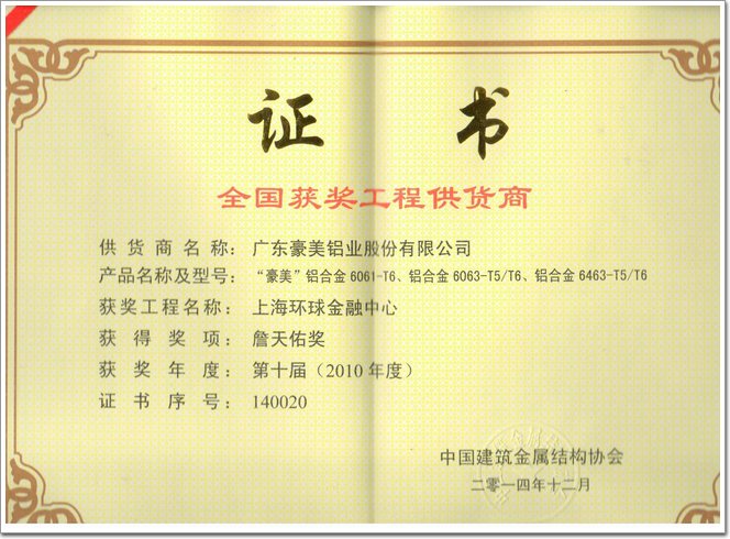 中國建筑金屬結構協會信息部于近日開展了為協會會員企業頒發“獲獎工程供應商”證書的活動,豪美鋁業作為上海地標性建筑——環球金融中心的幕墻產品供應商,憑借強勁的實力,順利入圍;且順利通過一系列的資料審核、公示等環節,成功摘獲“詹天佑獎”上海環球金融中心的“獲獎工程供應商”。