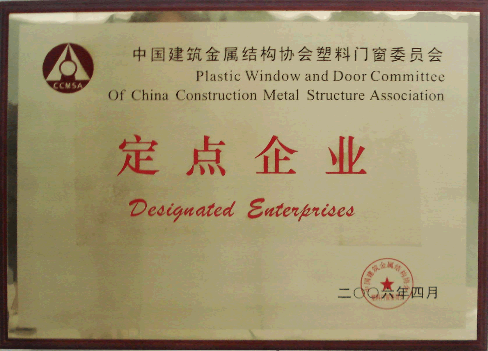 證書名稱: 06年塑料門窗定點(diǎn)企業(yè)