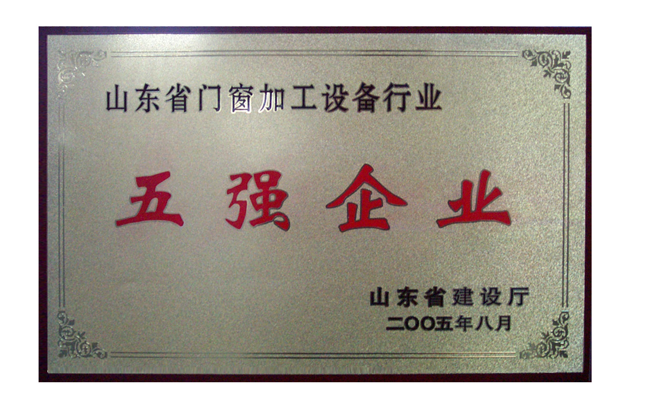 證書名稱: 山東省門窗加工設(shè)備行業(yè)五強(qiáng)企業(yè)