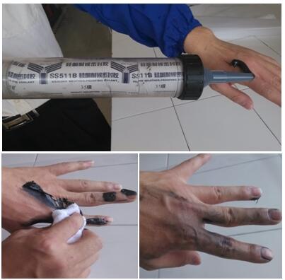 下面白云小編在這里通過實驗來給大家演示一下如何去除親密接觸的硅酮密封膠。如下圖所示,當密封膠粘在手上后,最好在它固化之前進行清洗。在這段時間內,只需先用抹布、手帕或者衛生紙就能將大部分密封膠擦掉,手帕可以擦掉大部分未固化的硅酮密封膠。