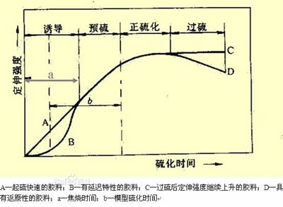 硫化時間-定伸強度 硫化誘導期(焦燒時間)內,交聯尚未開始,膠料有很好的流動性。這一階段決定了膠料的焦燒性及加工安全性。這一階段的終點,膠料開始交聯并喪失流動性。硫化誘導期的長短除與生膠本身性質有關,主要取決于所用助劑,如用遲延性促進劑可以得到較長的焦燒時間,且有較高的加工安全性。 硫化誘導期以后便是以一定速度進行交聯的預硫化階段。預硫化期的交聯程度低,即使到后期硫化膠的扯斷強度,彈性也不能到達預想水平,但撕裂和動態裂口的性能卻比相應的正硫化好。