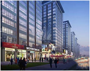 | 本工程石材幕墻位于群樓,各種復雜的造型是本工程的難點之一。面板為25mm厚花崗巖,采用密封打膠體系,縫為8mm,墻面區域立柱采用80×60×4鍍鋅矩型鋼管。